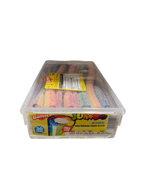 Bonbon multicolore acidulé en forme de tube d'une longueur de 23 cm, fourré d'une délicieuse pâte aromatisée.
