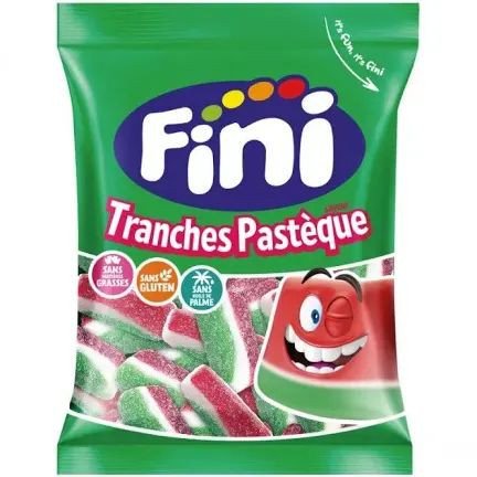 Sachets de 90 grammes de bonbon gélifié en forme de Tranche de Pastèque de la marque Fini destinés à la revente à la pièce.