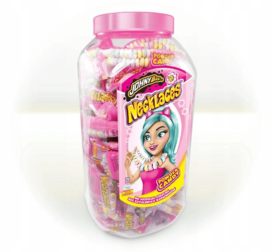 Collier de bonbon en sucre dur aromatisé (dextrose) enveloppé individuellement. Sans colorants artificiels.